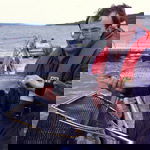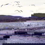 We are lucky there is no mist; everything is visible as we cross over to the huge netted salmon cages and clamber on to the floating platforms that surround them. Our beloved creatures, sensing that movement on the platform heralds food, are jumping out of the water, leaping up, sometimes four feet from the surface. It is a truly dazzling display as the light catches their iridescent beauty.