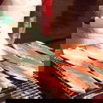 It takes 24 hours for the salt to penetrate through the flesh of the salmon, then the sides are rinsed and laid on racks inside large kilns and given ten hours smoking. The smoke permeating the kiln emanates from sawdust and chippings that come from red oak trees grown in Russia. The temperature is 28°C and is constantly balanced against a 65 per cent relative humidity.