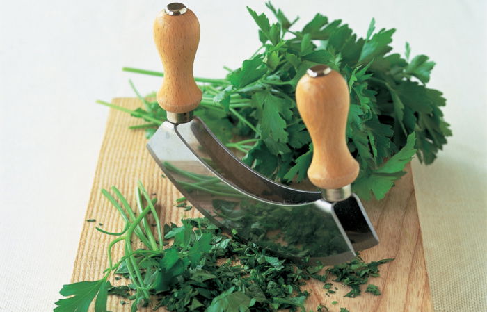 Ideally you need a good-sized cook’s knife, with a 7 inch (18 cm) blade that is slightly curved. Arrange the herbs on the chopping board by spreading them out, then rest the blade of the knife horizontally on the board at the edge furthest away from you. Hold the pointed end between the finger and thumb of one hand to steady it, take the handle in the other hand, and make sharp cutting movements swinging the handle towards you as you chop – so that the blade swivels in a fan shape across the herbs, and back again. Your reward, I promise, will be a deliciously aromatic, herb-scented kitchen.