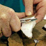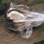 Now remove the pieces from the bag and, using a cloth to protect your hands, prise the tip of a kitchen knife between the nut and the shell. You should find you can force the whole piece out in one go. Sometimes if the coconut is quite dry it will come away very easily.