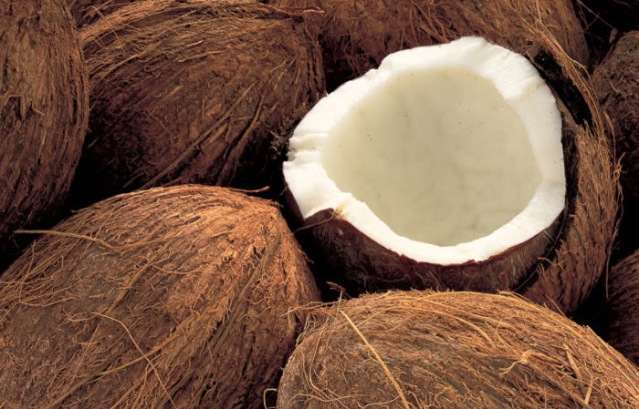 Dealing with a fresh coconut (which does not, I admit, look user-friendly) is not as difficult as it seems. First push a skewer into the three holes in the top of the coconut and drain out the milk and reserve it if the recipe needs it. Then place the coconut in a polythene bag and sit it on a hard surface – a stone floor or an outside paving stone.