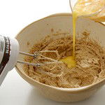 Lightly beat 4 large eggs and add this, a little at a time, to the creamed mixture. It can sometimes happen that the beaten eggs are added to the sugar-and-fat mixture too quickly, causing the whole mixture to separate. This breaking-up means that some of the air incorporated at the creaming stage will escape and the finished cake will be slightly heavier. For beginners, the way to avoid this is to add the beaten eggs just a teaspoonful at a time, whisking preferably with a hand whisk. If it does curdle, though, don't worry: the cake won't be as light, but it's not a disaster.