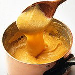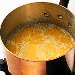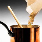 To make about 30 choux buns you will need 2½ oz (60 g) of strong plain flour, which, with its higher gluten content, gives crisper results than ordinary soft, plain flour. As you are going to need to 'shoot' it quickly into the water and melted butter, fold a sheet of silicon paper (baking parchment) to make a crease and then open it up again. Sift the flour straight on to the square of paper and add a teaspoon of caster sugar if you are making sweet choux, otherwise use a seasoning of salt and pepper.