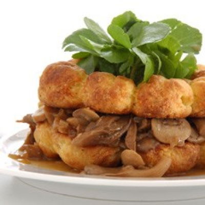 To make the choux buns, place teaspoons of the mixture on the baking sheet, leaving 1 inch (2.5 cm) between them, then bake on a high shelf in a pre-heated oven – gas mark 6, 400°F (200°C) – for 10 minutes. After that, increase the heat to gas mark 7, 425°F (220°C), and bake for a further 15-20 minutes until the buns are crisp, light and a rich golden colour.