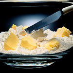 The fat should be at room temperature and soft enough for a knife to make an indentation straight through it in a second. This is the single most important rule to remember because it needs to be incorporated into the flour as quickly as possible – if it is too cold, you will have to rub it in for twice as long; the fat will become oily with the warmth of your hands and the pastry will be difficult to roll out.