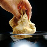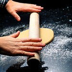 Place the dough on a lightly floured surface and use a rolling pin that is absolutely straight. Lightly dust it with flour and place it in the centre of the dough. Place the flat of your hands lightly on each end of the pin and begin to roll, re-dusting the pin and the surface lightly with flour if you need to stop the pastry sticking. If you want to roll it out to a round, give it quarter-turns as it expands and, provided you roll backwards and forwards, not side to side, it will roll out into a round shape. If you want an oblong, just knock the sides gently with the rolling pin to keep it in shape; if you want a square, give quarter-turns – as for a round – and then square it up using the rolling pin to knock the edges into shape.