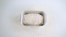 Now put the dough into a well-buttered loaf tin and sprinkle the surface with a generous dusting of flour.
