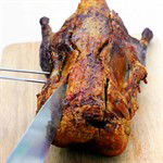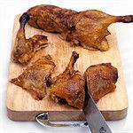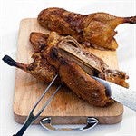 After years of cutting a roast duck into rather inelegant quarters I have now discovered the correct way to carve the whole thing into eight perfect portions to serve four people.