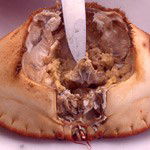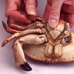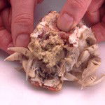 Now put your thumbs against the hard shell close to the crab's tail, and push and prise the body section out and away from the shell.