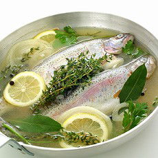 Poaching is fast, easy and no fuss, and if you want to serve a sauce with the fish then using the poaching liquid introduces the flavour of the fish itself. Rolled fish fillets, such as plaice or sole, can be poached in white wine or cider, which will make a lovely sauce. Trout can be poached in a pan of water to which a glass of dry white wine or cider has been added, along with a few sprigs of fresh herbs, a couple of bay leaves, slices of lemon, thin onion slices and a few black peppercorns. Don't bother with fish kettles, which take up far too much storage space; large, whole fish are better oven-baked in foil. The timings that follow are guidelines only, so just remember that thicker pieces of fish will need the longer times, thinner pieces the shorter.