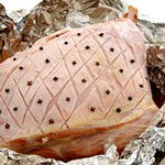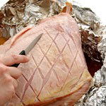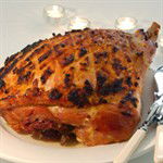 If the ham is going to be served hot, allow it to rest for 45 minutes after removing it from the oven so that the juices will seep back into the meat and the meat will firm up and be easier to carve. It is delicious served with Cumberland sauce.
