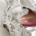 Begin by placing one sheet of foil lengthways in the roasting tin and another piece widthways. Remove the ham from the soaking water and place it in the middle of the foil. Wrap it in the foil to create a 'tent effect', so that it is tightly sealed but with room for the air to circulate around the ham. Bake the ham in a pre-heated oven, gas mark 3, 325°F (160°C), for 20 minutes per lb (450 g). That would be 4 hours for a 12 lb (5.5 kg) ham or 4 hours 40 minutes for a 14 lb (6.5 g) ham.