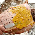 With a palette knife, quickly spread prepared English mustard all over the surface of the ham – you will need about 3 heaped tablespoons for a 12-14 lb (5.5-6.5 kg) ham.