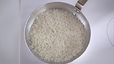Heat the pan gently over a medium heat, and then add groundnut or other flavourless oil, swirl it round and when its hot add the rice and turn the grains over so they become lightly coated and glistening with oil.