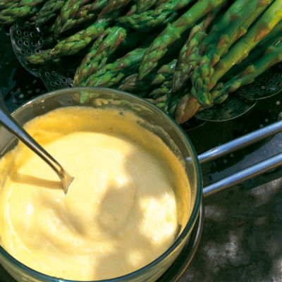 Serve the asparagus on hot plates with some sauce poured over the tips. Pick them up with your hands and eat down to the tough ends, dipping in the sauce after each bite. Also, don’t forget to have finger bowls and napkins at the ready. 1 lb 4 oz (570 g) of asparagus will serve 4 as a starter.