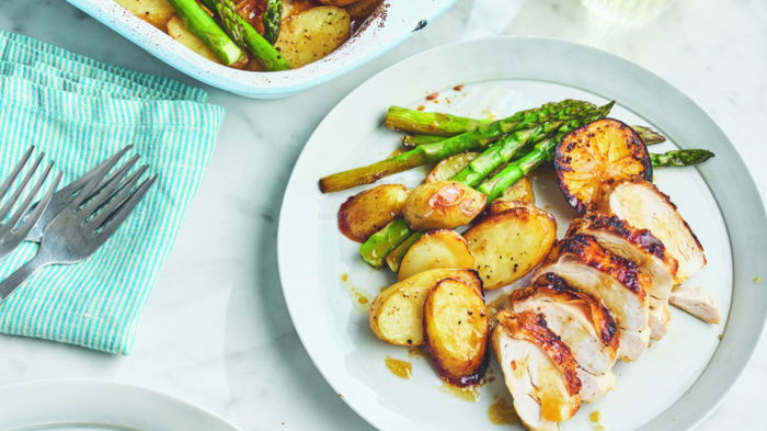 ▶ If using boneless, skinless breasts or thighs in the air fryer, preheat the air fryer to 190°C/375°F. Chicken breasts will need to be flattened first so they are evenly 2cm (¾ inch) thick. Toss the potatoes through half of the lemon and honey mix and tip into a liner or air fryer tray. Cook for 5 minutes. Give the potatoes a turn, add the chicken, lemon slices and the rest of the lemon and honey mix, season and cook for 8 minutes. Add the asparagus, drizzling with a little olive oil and squeezing over the remaining lemon half. Cook for 8 minutes.