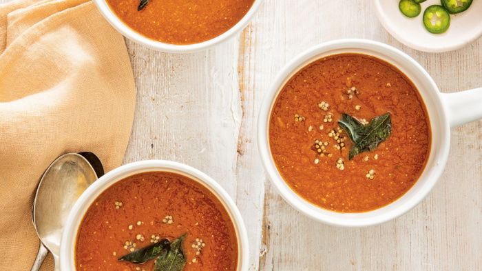 By far the most popular recipe in my last book was the Buttery Tomato Soup. Here I wanted to create something similar in terms of very fast prep time with the same comfort factor. We are a household that loves spice, so this recipe – inspired by one from Madhur Jaffrey in her excellent Curry Easy – does it for us. And it happens to be even faster in terms of prep and cooking! You don’t have to be bound by any of these flavours – it is an excellent receptacle for any spice or curry paste you might want to use up.