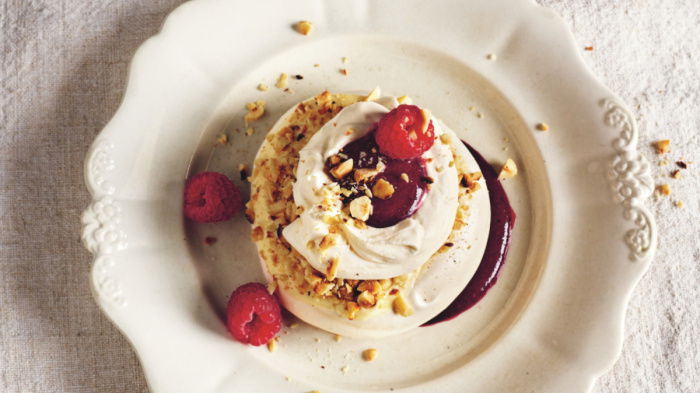 As it is one of Australia’s classic dishes, I feel it should be made with something exotic like passion fruit, but when Andrew Sullivan, the pastry chef at The Seafood Restaurant, made these I was very taken with them. I asked Andrew to send me the recipe, which was for about fifty portions of a lovely seasonal dish using cobnuts and damsons. I have cut it back to a more manageable eight servings and made it suitable for winter by using hazelnuts and frozen berries. Thanks, Andrew.