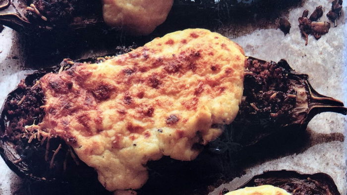 Wipe the inside of the aubergines with kitchen paper, lightly oil the skin and inside surface of each half and place them on a lightly oiled baking sheet, putting them side by side to fit quite closely. (If they're quite round and you have trouble making them sit straight you can add a little crumpled foil to hold them in place.) Now divide the filling equally between the aubergines, then place the baking sheet on the middle shelf of the oven and bake them for 1¼ hours or until completely soft when tested with a skewer. While the aubergines are cooking you can prepare the topping. All you do is place the milk, flour, butter and grated nutmeg in a saucepan and, using a balloon whisk, whisk until it comes up to simmering point and it becomes a smooth, glossy paste.