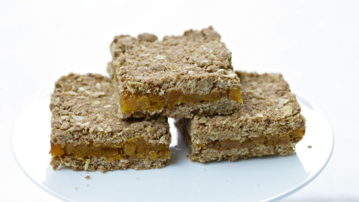 Answered by Lindsey: Hello, We have been making this recipe for many years, but it’s been a while since my last batch, so I have made this again today. Firstly, it is supposed to be a bit crumbly, it is part of the charm. That said it should hold together sufficiently to cut into squares. The chopped apricots need to be the soft eating variety so that they feel a bit squidgy when they are chopped. I pulsed mine in the processor today and they were chopped but sticky. I pressed the base down very firmly then sprinkled the apricots very evenly and pushed them out a bit with my fingertips (which I dipped into water as the apricots were so sticky). Then I pressed the remaining oat mixture down well. I baked for 25 minutes. After 10 minutes cooling the ‘cake’ in the tin it was still quite warm but with a fine serrated knife I cut some squares. They were fragile and I did have to be very careful when transferring them to the cooling rack. The remainder of the cake I left in the tin until nearly cold (at this point it feels much firmer) then lifted it with the liner onto a board. As the whole thing was much firmer, it was easier to cut neat’ish’ squares. There are still a few crumbly edges. I took plenty of snaps, so I’ll try and send you some. My family and I have eaten many more that we should have this evening and they really are lovely, so I hope you give them another try. Any that might crumble are delicious sprinkled over yoghurt or fruit compote or ice-cream. I hope this helps Best wishes Lindsey