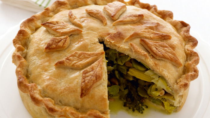 Now add the toasted pine nuts, capers and cornichons to the vegetables and gently give it all a thorough mix to coat everything lightly, adding a little more sauce if necessary. Have a taste now and add more seasoning if necessary before piling it into the lined pastry. Now roll the remaining pastry 3mm thick and 24cm wide and dampen the edges of the base and lay the lid on the top.