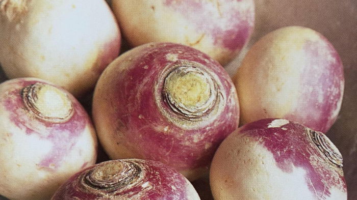 Baby turnips about the size of golf balls are creamy white with leafy green tops, and usually sold in bunches in the summer when they are in season.
