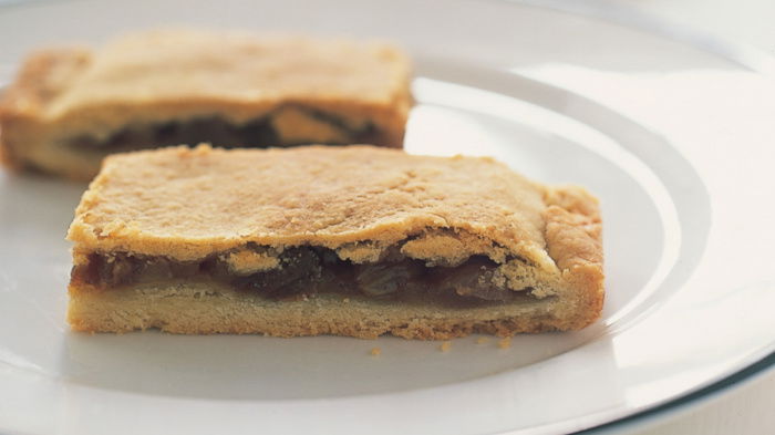 Now roll out the remaining pastry on a lightly floured board to the size of the tin, roll the pastry over the rolling pin and transfer it to the tin to cover the apple filling, pressing lightly round the edges to seal. Now into the oven with it for 20-25 minutes, or until the pastry is lightly golden. Then dust with icing sugar, if you like, and leave to cool in the tin before cutting into fingers