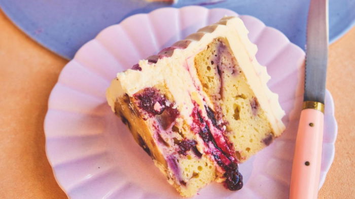 2 Start by making the sponge. Put the butter, yoghurt, eggs, lemon zest and juice, flour and sugar in a large bowl. Mix briefly with an electric whisk until the batter just comes together. Divide half the batter equally between the prepared tins. Sprinkle over half the blueberries, then top with the remaining batter. Sprinkle over the remaining blueberries.