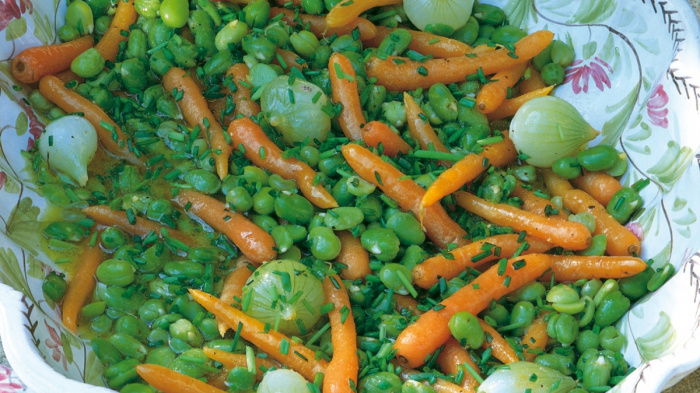 When the vegetables are tender but still retain their bite, remove the steamer, throw out the water from the pan and put the broad beans in the pan along with the rest of the vegetables and the dressing and toss everything around over a gentle heat for about 1 minute.