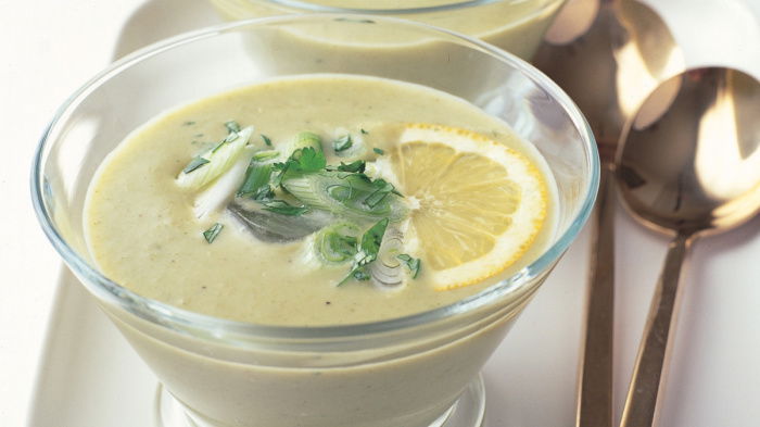 I think it's a good idea to serve the soup in glass bowls that have already been chilled. Add a cube of ice to each bowl and sprinkle in the rest of the coriander (finely chopped) and the spring onions as a garnish. Finally, float some lemon slices on top and serve straight away.