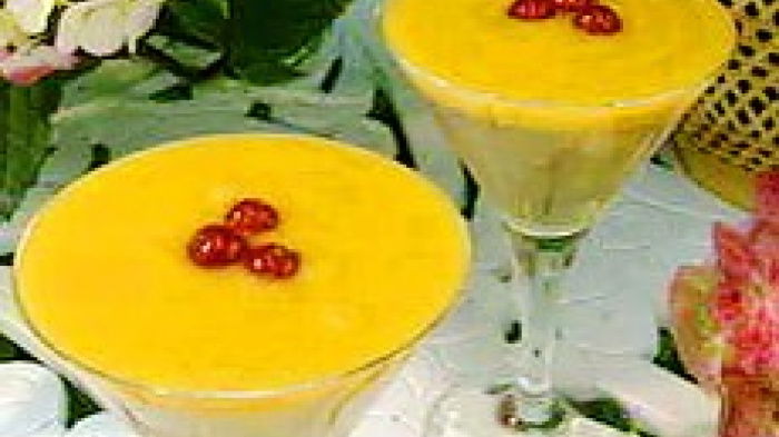 First make a cut all around each peach, then give a little twist to separate the halves. Remove the stones, then bring a saucepan of water up to the boil and pop the peach halves in for about 1 minute. After that remove them with a draining spoon and slip off the skins. Now transfer the peaches to a food processor, add a little lime juice and caster sugar to taste (it's difficult to be specific here because peaches vary so much) and whiz them to a purée. Before serving the jellies, spoon the peach purée over the surface as a topping and garnish each one with a fresh strawberry or a few cherries.