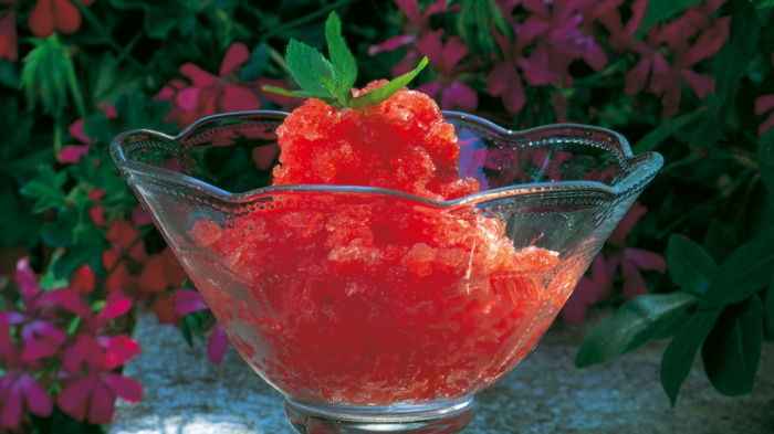 I like to serve the granita in small, narrow, unstemmed glasses – but any wine glasses will do so that the sparkling colour can be seen in all its glory.