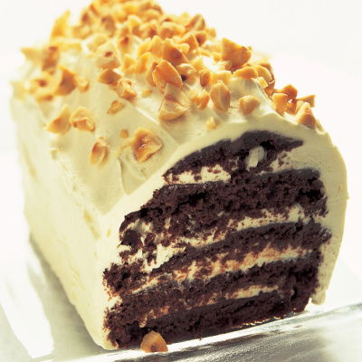 Rolling this cake up is going to be a lot easier than you think. All you do is take hold of one edge of the greaseproof paper beneath it, lift it and, as you lift, the cake will begin to come up. Just gently roll it over, pulling the paper away as it rolls. If the cake itself cracks as you roll it, this is not a problem – it's all going to get covered in chocolate anyway!