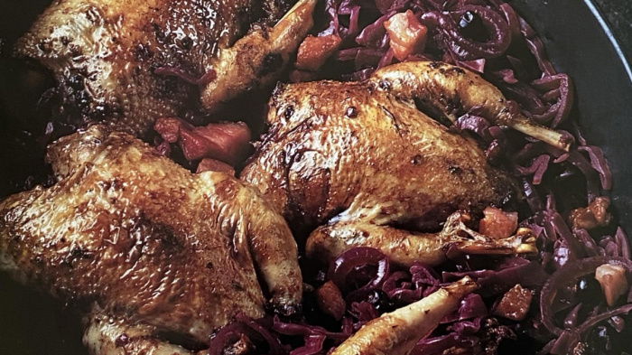 This is a delightful way to serve plump little partridges, one per person, and the combined flavour of red cabbage, garlic and juniper are the perfect match.