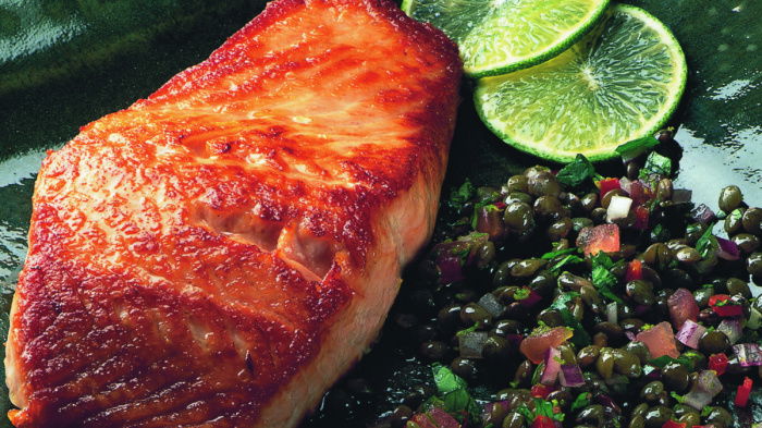 While the lentils are cooking, skin the tomatoes by pouring boiling water on to them. After 1 minute remove them and slip the skins off, then halve and squeeze out the seeds. (You can watch how to do this in our Cookery School Video). Chop the flesh into small pieces. After that chop the onion, chilli and coriander leaves very small and keep all this aside, covered with clingfilm, until needed. When the lentils are cooked, discard the coriander stalks and empty the lentils into a bowl and, while they are still warm, toss them in the lime juice and olive oil. Add the seasoning and taste to make sure you add enough. Now add the rest of the prepared salsa ingredients. Mix well, cover and leave in a cool place.