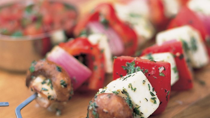 Next, de-stalk the chilli, cut it in half, remove the seeds and chop the flesh very finely before adding it to the tomatoes. Add the chopped onion, coriander and lime juice, and season with salt and pepper. Give everything a thorough mixing, then cover and leave on one side for about an hour before serving. When you're ready to barbecue the kebabs, take the two skewers and thread a mushroom on first (pushing it right down), followed by a piece of onion, a piece of pepper and a cube of cheese. Repeat this with more onion, pepper and cheese, finishing with a mushroom at the end.