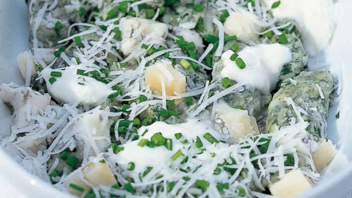 To cook the gnocchi, have all the cheeses ready. Pre-heat the grill to its highest setting, then bring a large, shallow pan of approximately 6 pints (3.5 litres) of water up to simmering point and put the serving dish near the grill to warm through. Now drop the gnocchi into the water and cook them for 3 minutes; they will start to float to the surface after about 2 minutes, but they need an extra minute. When they are ready, remove them with a draining spoon and transfer them straight to the serving dish. When they are all in, quickly stir in first the mascarpone and chives, then sprinkle in the Gorgonzola and Fontina, then add some seasoning and cover the whole lot with the grated Pecorino.