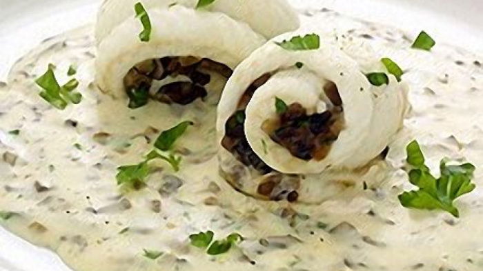Next cut the fish fillets in half lengthways and spread an equal quantity of the mushroom mixture on the skinned side of each piece. Roll up the fillets from the head to the tail end and place closely together in a baking dish. Pour in the wine or cider, place a piece of buttered silicone paper (parchment) directly on top of the fish and bake in the oven for 20 minutes.