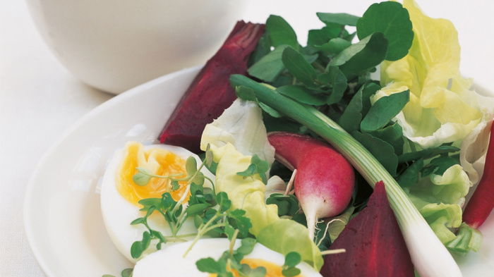 Bring the water up to simmering point and give them exactly 9 minutes from the time it starts boiling. Then cool them under cold, running water to stop them cooking any further. Now peel away the shells, cut the eggs in half and place the yolks only in a mixing bowl. You can watch how to do this in our Cookery School Video on this page.