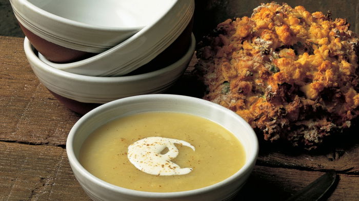 Then, return the soup to the casserole and bring it back to a gentle simmer, tasting to check seasoning before serving. Serve in hot bowls with the yoghurt (or crème fraîche) spooned on top and the celery salt sprinkled over, garnished with a few celery leaves.