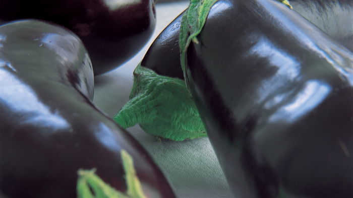 (If you are cooking a double quantity, measure out half of them into a bowl and when they have got quite cold, cover the bowl with clingfilm and store in the fridge.) Next prepare the aubergines: place the cubes in a colander, sprinkle them with a little salt, then cover with a plate weighted down with a saucer topped with some scale-weights. Leave them to drain for 20 minutes, then squeeze them dry in a clean tea-cloth.