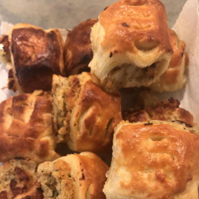 Meanwhile heat 1 tablespoon of oil in a frying-pan and cook the onion and pepper together in it until they are softened – about 8-10 minutes. Then remove them to a plate, add the rest of the oil to the pan and cook the aubergine, which will also take about 10 minutes to soften. After that add the garlic, cook that for a minute then return the onion and pepper to the pan. Now mix the wine and tomato purée together with the cinnamon and parsley in a jug, then pour this into the vegetable mixture.
