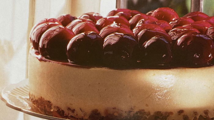 To serve the cheesecake, toss each whole cherry briefly into the syrup to give it a gloss, then arrange on the cheesecake. Cut into slices and hand the sauce around separately.