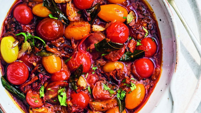 Just before serving, heat the oil or butter in a large ladle over a medium heat, and add, in this sequence, the remaining 10 curry leaves, the garlic, cumin and fennel seeds and the torn bits of chilli, and fry for 8–10 seconds. Pour this over the tomatoes and stir.
