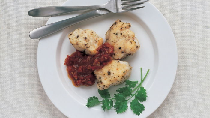 It has a lovely, firm, meaty texture, and I think this particular recipe would be a superb choice for someone who wants to cook something quite special but has very little time. The pieces of fish are coated with crushed mixed peppercorns and this simplest of sauces not only tastes divine but looks amazingly colourful in contrast to the fish.