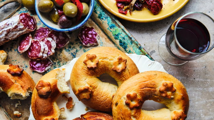 Aniseed bread. Bread is sacred all over Italy, but in Salemi in Western Sicily, it's also an artform, often worked into shapes depicting animals, fish, plants and religious figures; traditionally given to the church or the poor on annual feast days. There is even a museum in the town to showcase the elaborate sculptures. This particular bagel-type bread from Marsala was traditionally made during Easter to represent the crown of Jesus. The name squarato means ‘parboiled’ as it is boiled before baking, resulting in a smoother, shinier crust.