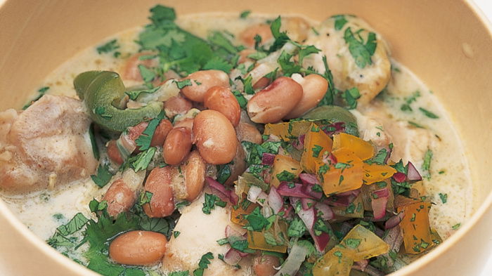 In the meantime, make the salsa. Simply combine half the reserved coriander leaves and the rest of the salsa ingredients and add seasoning. Mix well, then cover and leave aside to allow the flavours to develop. When the chilli has had its initial cooking time, deseed the pepper and cut it into ½ inch (1 cm) pieces. Then stir the chicken and pepper into the casserole, season well with salt and freshly milled black pepper, cover, and simmer for a further 30 minutes.