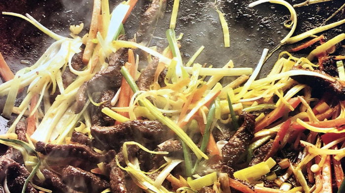 Next add the liquid – soy sauce, sherry and 2 tablespoons of water. Then, as soon as the liquid is very hot, stir in the noodles, combining them with the vegetables. Finally, return the meat to join all the vegetables, toss everything together a couple of times and serve immediately in hot bowls.