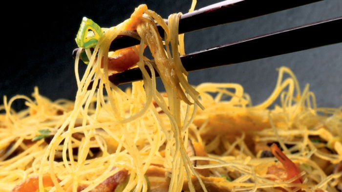 Next, heat the oil in the wok and when it's very hot add the chopped onion and mushrooms, soaked shrimps, the chopped bacon, garlic and ginger. Stir them round in the hot oil, then reduce the heat and gently let all the ingredients cook together for about 15 minutes. This initial slow cooking allows all the delicious flavours and aromas to permeate the oil. After 15 minutes, add the curry powder and salt to the cooked ingredients, then drain the noodles in a colander – give them a really good shake to get rid of any excess water.