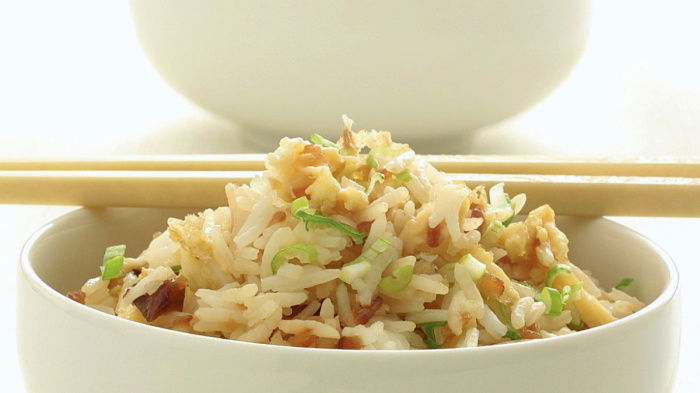 When you are ready to stir-fry, heat half the oil in the frying pan and when it's really hot, quickly fry the onions for 3 minutes, moving them around in the pan until they are tinged brown. Now add the remaining oil to the pan and, when it's smoking hot, add the rice and stir-fry this time for about 30 seconds. Now spread the ingredients out in the pan and pour in the beaten egg. It won't look very good now, but keep on stir-frying, turning the mixture over, and the egg will soon cook into little shreds that mingle with the other ingredients.